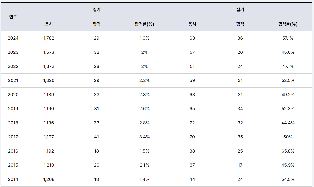 직장 병행 수험생이 대부분이라, 긴 준비 기간과 높은 탈락률 때문에 “독학으로는 버겁다”는 의견도 많아 정신적 난이도까지 높은 편입니다.