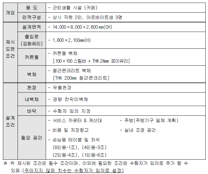 • 평가항목: 건축실내의 설계에 있어 각종 유형의 실내디자인을 계획하고 실무도면을 작성하기 위한 개념도, 평면도, 천장도, 입면도, 상세도, 투시도 등의 작성능력을 평가