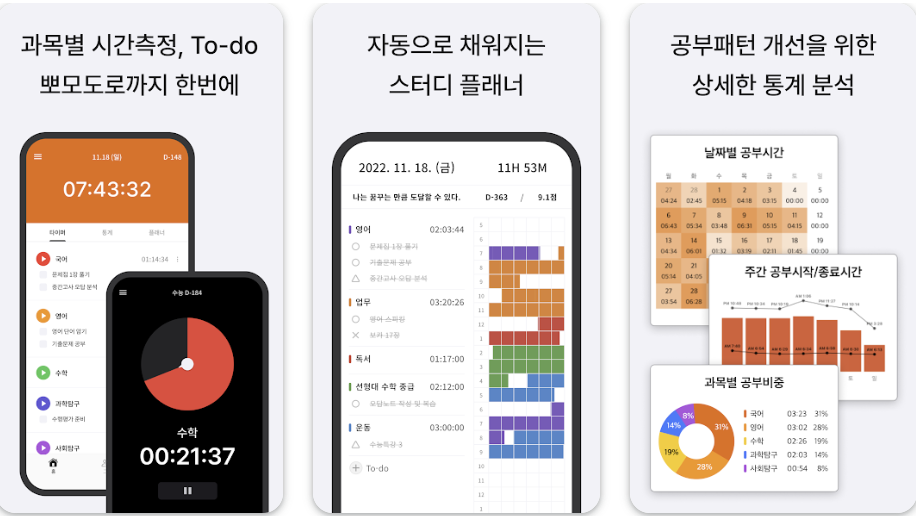 깔끔한 인터페이스와 빠른 반응 속도, 그리고 아이폰/안드로이드 모두 지원하는 호환성까지 갖춰져 있어 공부 습관 만들기에 최적화된 어플입니다.
