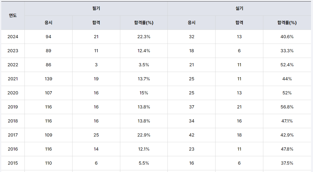 최근 연도별 통계를 보면 필기 합격률은 2018년 13.8%, 2019년 13.8%, 2020년 15%, 2021년 13.7%, 2022년 3.5%, 2023년 12.4%, 2024년 10.5%로 보고된다. 실기(면접) 합격률은 같은 기간 33~56% 수준으로 필기에 비해 높지만, 두 단계를 모두 통과한 최종 합격률은 3~5% 정도라는 분석이 있어 체감 난도는 상위권이다.