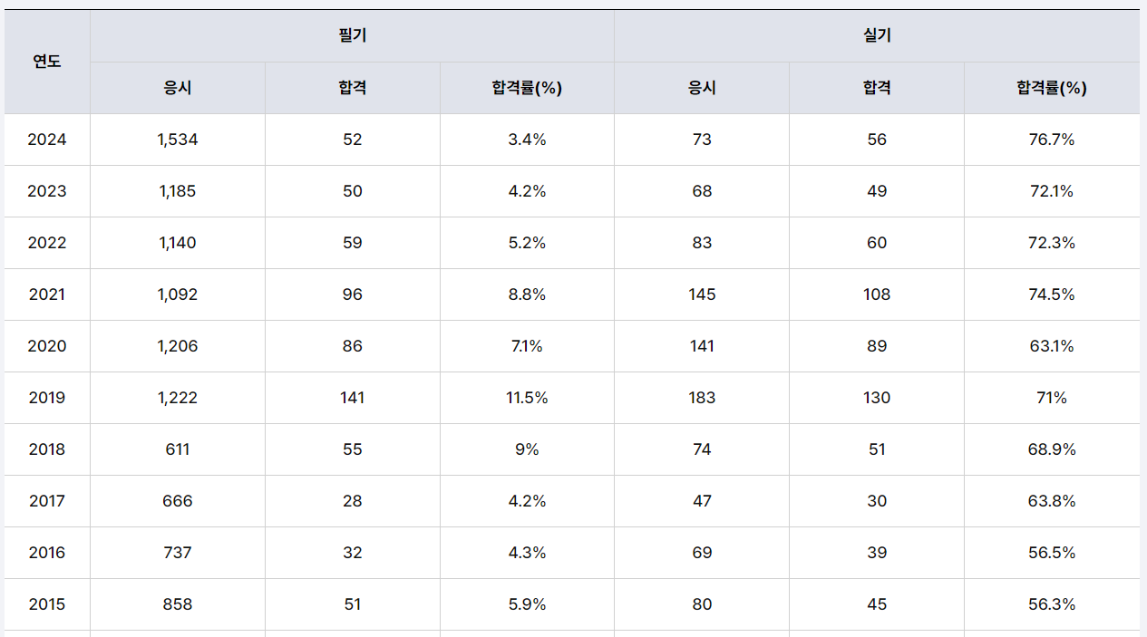 최근 3개년 기준 필기 합격률은 2021년 8.8%, 2022년 5.2%, 2023년 4.2%로 평균 약 6%이며, 실기 합격률은 같은 기간 72~75% 수준이다. 2013~2022년 장기 통계로 보면 필기 합격률은 최저 2.4%, 최고 11.5% 사이에서 움직이고, 전체 평균은 5~10% 구간에 형성돼 기술사 평균과 비슷하거나 약간 높은 정도로 분석된다.