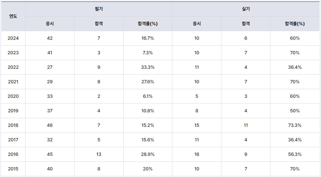 최근 5개년 필기 합격률은 2019년 10.8%(37명 중 4명), 2020년 6.1%(33명 중 2명), 2021년 27.6%(29명 중 8명), 2022년 33.3%(27명 중 9명), 2023년 7.3%(41명 중 3명)으로 평균 약 17% 수준이다. 실기 합격률은 2019년 50%(8명 중 4명), 2020년 60%(5명 중 3명), 2021년 70%(10명 중 7명), 2022년 36.4%(11명 중 4명), 2023년 70%(10명 중 7명)으로 50%대 유지되며, 연 최종 합격자 3~6명 내외다.